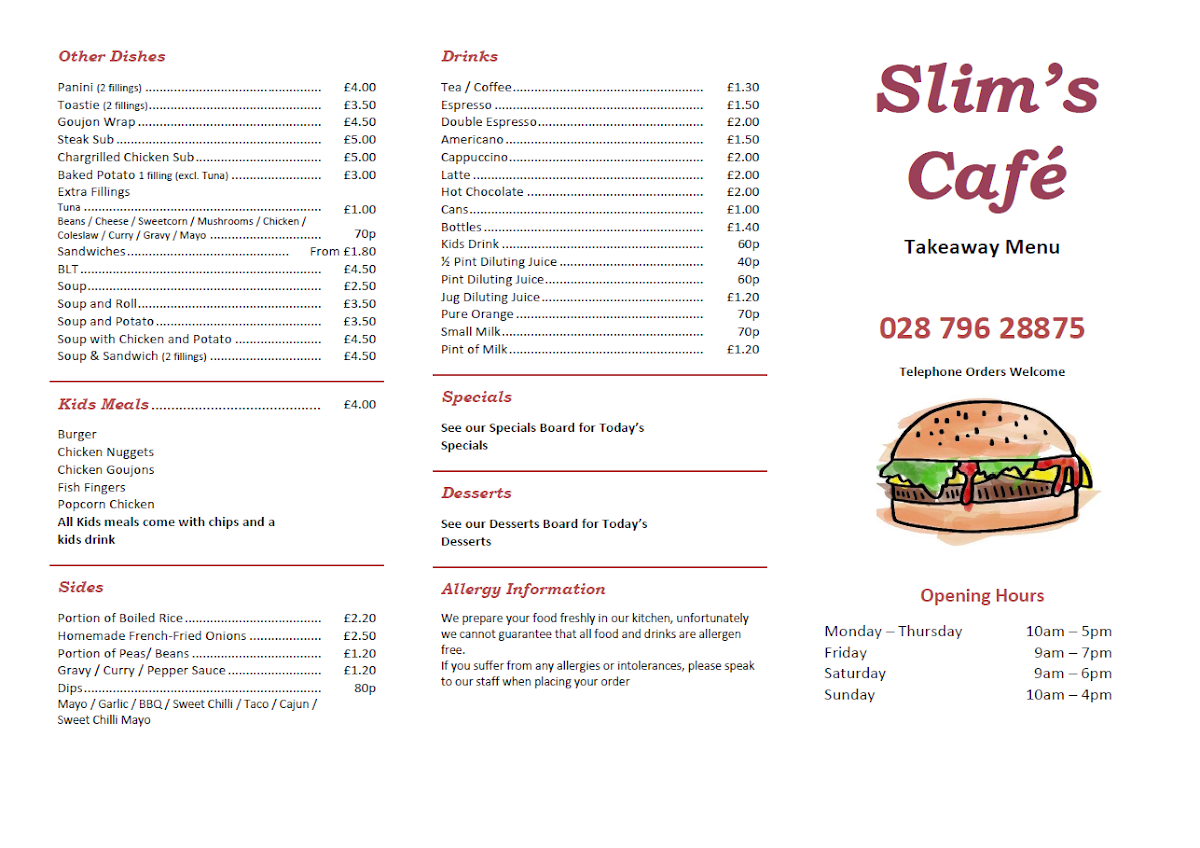 Slim's Cafe Menu